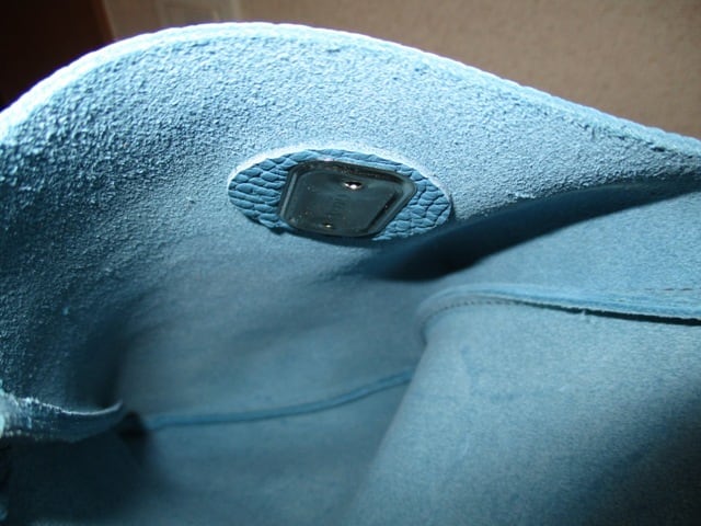 シルバー色の差し込み錠のシンプルな形です。ショルダーベルトは14ミリ幅のトリヨンで同じ色ですが、長さは金具の端から端までで90センチから130センチくらいまで2センチ刻みで穴を開けているので調節可能です。