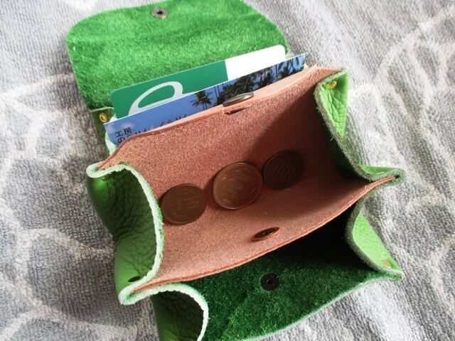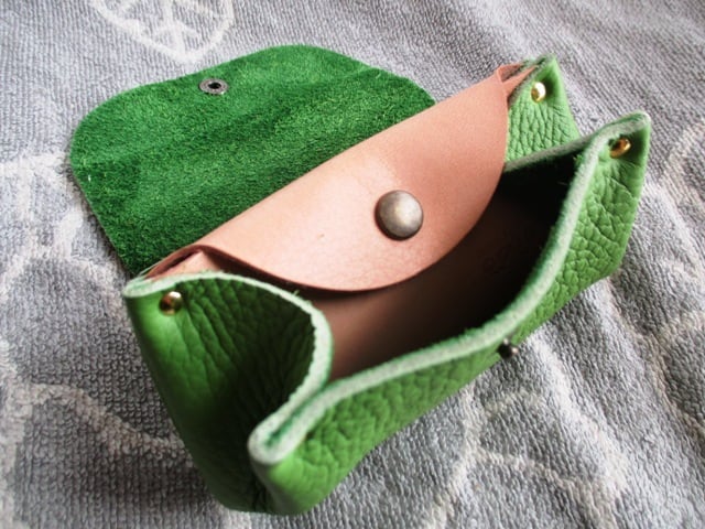 作品は1枚革を折りたたんで金具留めにした小さなポーチ(財布)です。