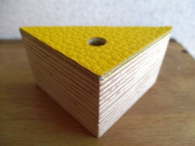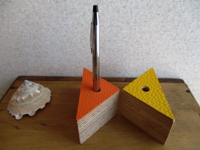 ブナ木材の積層ブロックに発色の良いトリヨンを合わせてペン立てを作りました。28枚の薄い板が縦横交互に28枚も重なっているのでストライプ模様になっています。