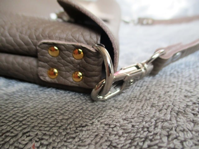 シルバー色の差し込み錠のシンプルな形です。ショルダーベルトは14ミリ幅のトリヨンで同じ色ですが、長さは金具の端から端までで90センチから130センチくらいまで2センチ刻みで穴を開けているので調節可能です。